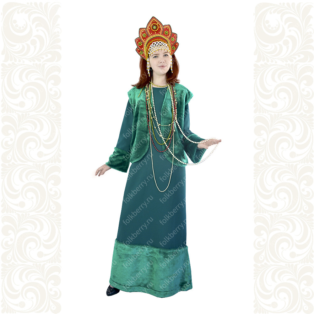 Карнавальный костюм "Новогодняя Елочка" (платье и кокошник) предназначен для выступлений на сцене, праздничных новогодних карнавалов и мероприятий. Платье выполнено из габардина глубокого зеленого цвета. Жилет, манжеты на рукавах, и подол украшены искусственным мехом. В комплект входят несколько ниток разноцветных бус и кокошник красного цвета, что завершает образ Новогодней елочки.