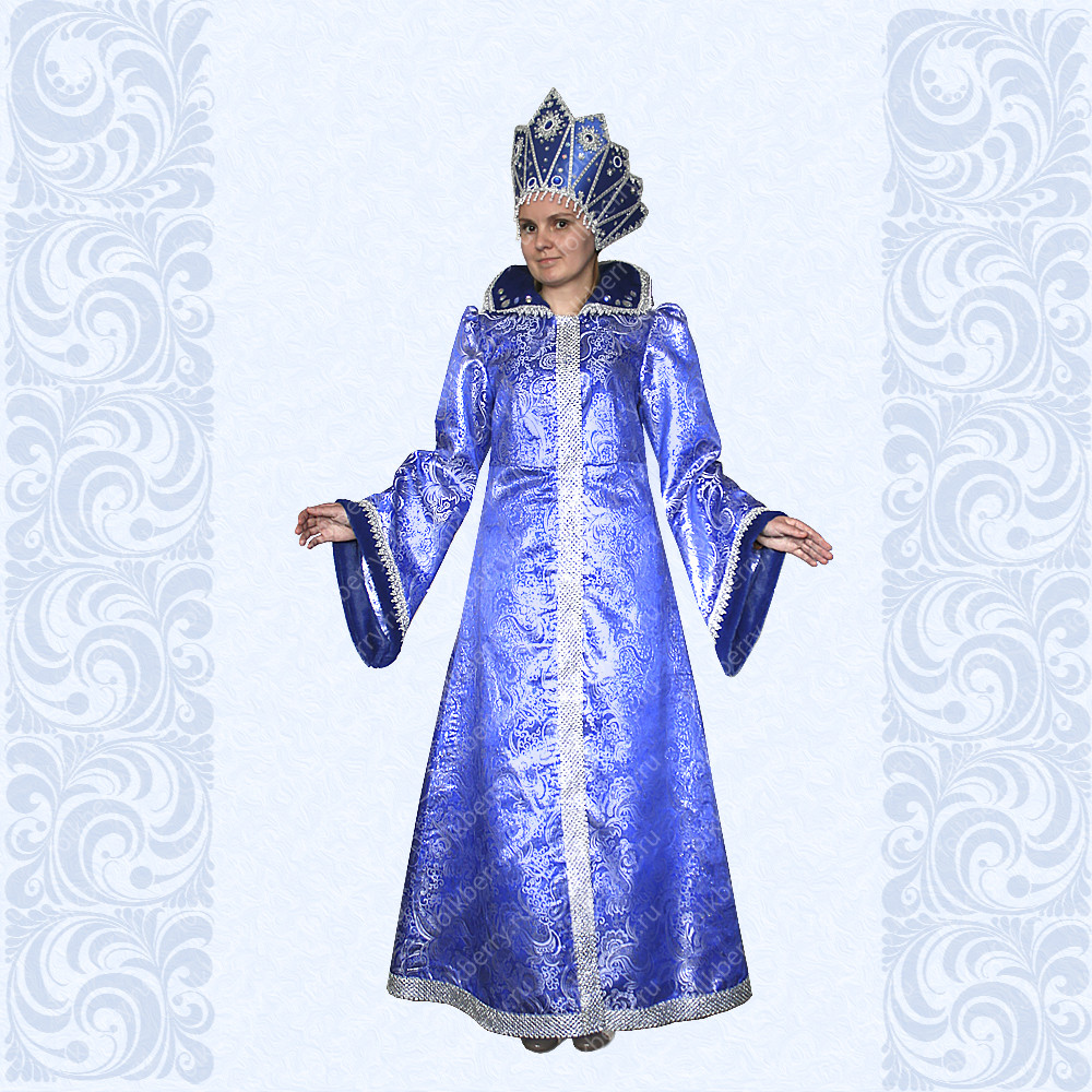 Костюм выполнен из парчи сине-серебряного цвета, украшен искусственным мехом синего цвета, ажурной тесьмой серебристого цвета, стразами. Кокошник входит в костюм.