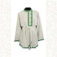 Косоворотка свободного покроя, с длинным рукавом, с поясом-кушаком. Декорирована жаккардовой тесьмой с изображениями славянских символов процветания, здоровья, удачи, благосостояния, силы. Декор четкий, понятный, напоминает вышивку крестом. Зеленый цвет декора тоже символичен. Косоворотка выполнена из плотной, мягкой льняной ткани белого цвета. Предназначена для праздничных моментов. Смотрится стильно и современно с современными элементами одежды.
