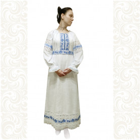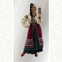 Костюм  выполнен из габардина и красиво подобранного декора в золотистых цветах. Достоинства габардина  в том, что он не мнется, не блестит, как атлас, ложится красивыми  мягкими складками, цвет не выгорает. Юбка  с оборкой, декор в золотистых цветах, по талии на  двойной резинке. Блуза  белого праздничного цвета, с баской,  рукава расширены внизу, с манжетами.   Сзади на блузе шнуровка. Она дает хорошую посадку по фигуре. Костюм предназначен для творческих  сольных и коллективных театральных выступлений.