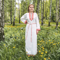 Фасон платья очень удачный и хорошо подходит всем покупательницам: горловину можно регулировать, рукав реглан хорош для всех типов фигур, удлиненный и немного расклешенный силуэт, как принято на Руси, слегка завышена талия. К платью прилагается длинный пояс с декором. Хочется отметить, что платье хорошо сидит на крупных и полных фигурах.