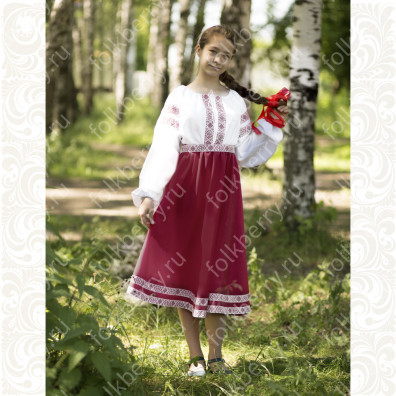 Платье «Дмитра» отрезное по талии, рукав реглан, юбка - почти солнце, длиной немного ниже колена. С поясом. Важно отметить, что декор платья выдержан в славянском стиле, но в целом, платье «Дмитра» - современное прочтение народных традиций. Как правило, дети и подростки с удовольствием выбирают его. Романтичное, удобное и нарядное, оно дарит ощущение радости и праздника. Замечательно подходит для тематических праздников в детских  учебных заведениях, по фасону и яркости цветов отлично подойдет для танцевальных коллективов. Платье выполнено из немнущейся, матовой ткани "габардин" символичных для славян цветов ( красного, синего, зеленого, бордового).
