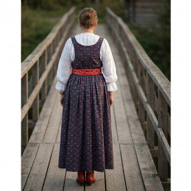 Платье сшито из яркого красного атласа и декорировано вставками с рисунком «хохлома». Юбка фасон полтора «солнца», подол и горловина украшены белым кружевом и тесьмой. Рукава «фонарики» сделаны из легкой, белой органзы.