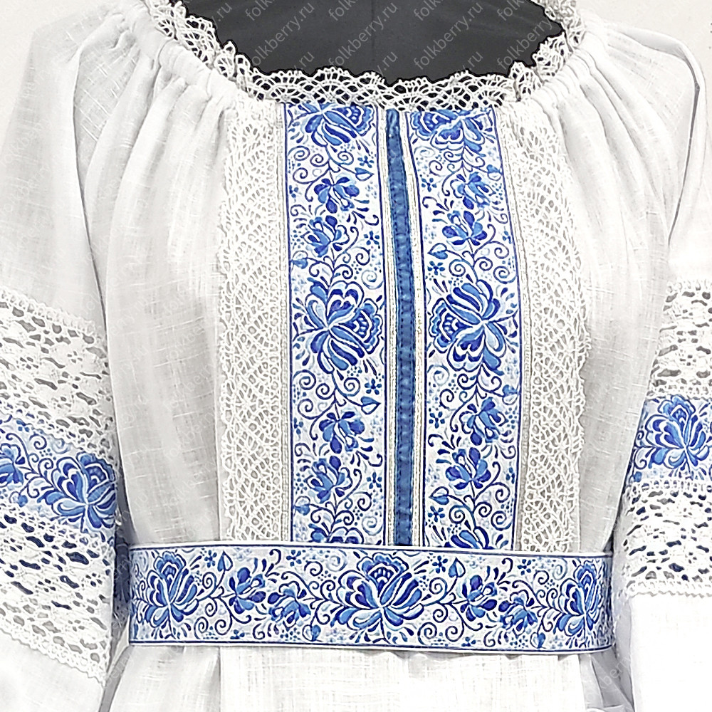Платье изготовлено из умягченного белого льна и украшено жаккардовой тесьмой с узорами Гжель и  белым кружевом разной ширины, а также бархоткой и  изысканной серебристой тонкой тесьмой. Платье силуэта А, расклешено к низу. В комплект входит  пояс с веревочками на концах. Рукава - удобный реглан, также декорированы кружевом и  жаккардовой тесьмой. Платье немного просвечивает, желательно надевать с легким подъюбником или юбкой-поневой.