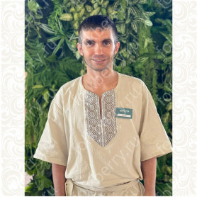 Платье изготовлено из умягченного белого льна и украшено жаккардовой тесьмой с узорами Гжель и белым кружевом разной ширины, а также бархоткой и изысканной серебристой тонкой тесьмой. Платье силуэта А, расклешено к низу. В комплект входит пояс с веревочками на концах. Рукава - удобный реглан, также декорированы кружевом и жаккардовой тесьмой. Платье немного просвечивает, желательно надевать с легким подъюбником или юбкой-поневой.