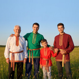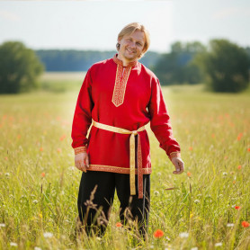 Русская народная рубаха (косоворотка) с кушаком. Изготовлена из хлопка, декорирована жаккардовой тесьмой. Яркий узнаваемый во всем мире рисунок "хохлома" и насыщенные цвета делают Косоворотку праздничной.
