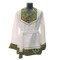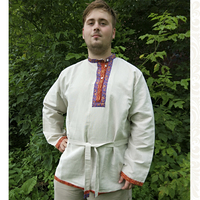 Мужская рубаха «Истоки» выполнена из хбелого льна, имеет втачной рукав. По низу изделия, вороту и рукавам расположена жаккардовая тесьма с обережным рисунком. Дополняет рубаху кушак (пояс) из ткани с тесьмой.
