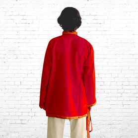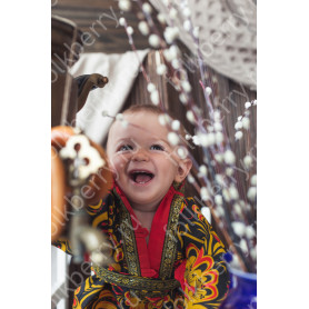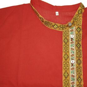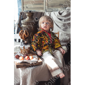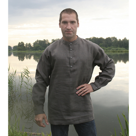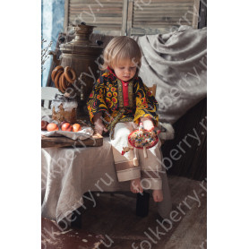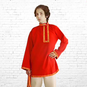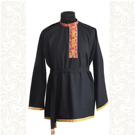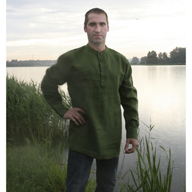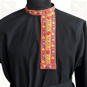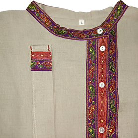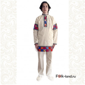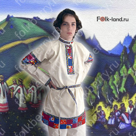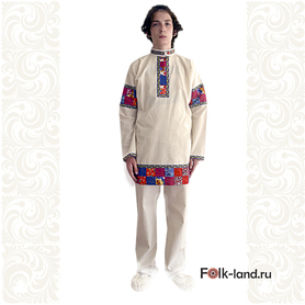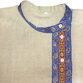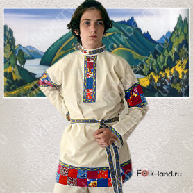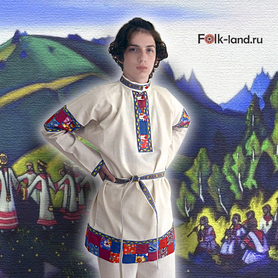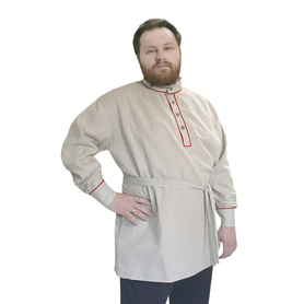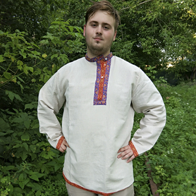 Рубаха мужская «Истоки» с коротким, втачным рукавом выполнена из белого льна. Ворот, рукава, низ изделия оснащены декором из жаккардовой тесьмы с традиционными славянскими обережными узорами. Модель комплектуется поясом (кушаком) из ткани с тесьмой.