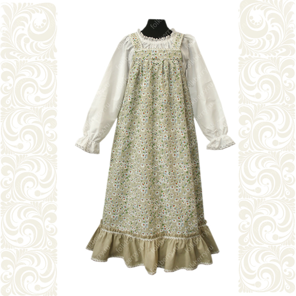 Выполненный в православном стиле сарафан с блузой «Дуняша», сшит из натурального хлопка в мелкий цветочек. Модель скромно декорирована однотонным воланом в цвет с основной тканью и тесьмой вьюнок. Можно носить с поясом и регулировать бретели по длине. Белая блузка из мягкого хлопка с длинным рукавом реглан украшена по горловине и рукавам натуральным нежным белым кружевом. В комплект к сарафану с блузой можно подобрать головной убор. Сарафан подходит для учениц православных школ и детских садов, для посещения церкви, православных праздников.