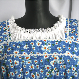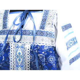 Сарафан сшит из хлопка ( большие размеры из габардина) светло-голубого цвета. Длина – 130 см, бретели регулируются. Наряд украшен жаккардовой тесьмой и «вьюнком».