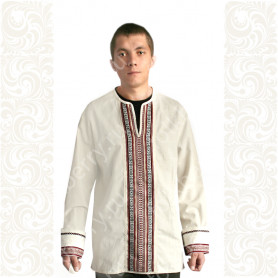 Блуза изготовлена из хлопковой ткани белого цвета. Рукава блузы длинные и пышные, декорированы тесьмой.
