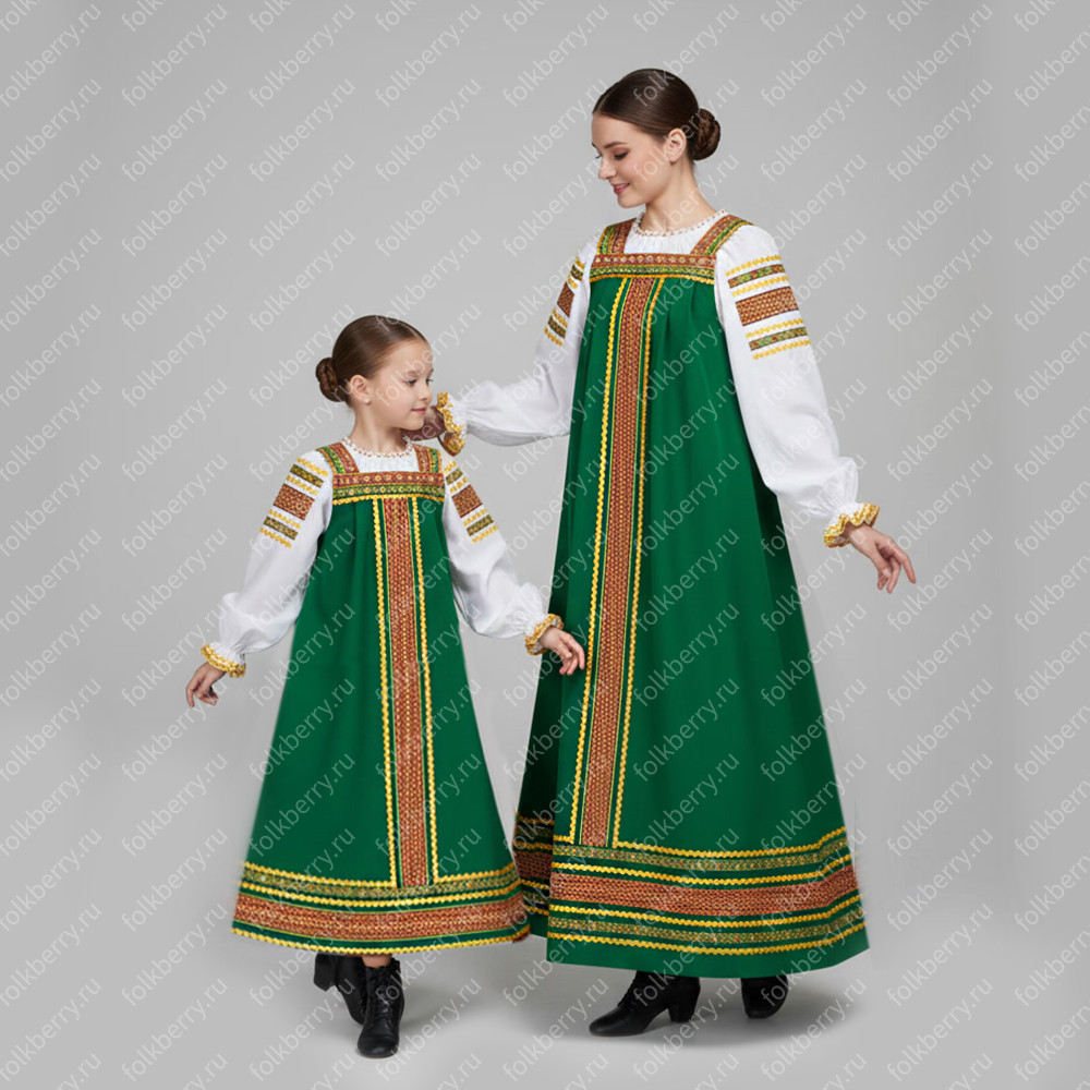 Сарафан с блузой Народный, габардин и хлопок, зелёный