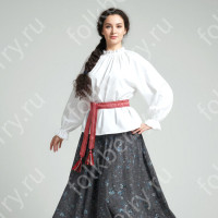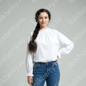Блуза сшита из хлопка, по рукавам красиво декорирована жаккардовой тесьмой. Горловина регулируется по глубине при помощи завязок.
