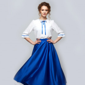 Костюм  выполнен из габардина и красиво подобранного декора в золотистых цветах. Достоинства габардина  в том, что он не мнется, не блестит, как атлас, ложится красивыми  мягкими складками, цвет не выгорает. Юбка  с оборкой, декор в золотистых цветах, по талии на  двойной резинке. Блуза  белого праздничного цвета, с баской,  рукава расширены внизу, с манжетами.   Сзади на блузе шнуровка. Она дает хорошую посадку по фигуре. Костюм предназначен для творческих  сольных и коллективных театральных выступлений.