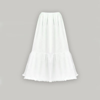 Костюм  выполнен из габардина и красиво подобранного декора в золотистых цветах. Достоинства габардина  в том, что он не мнется, не блестит, как атлас, ложится красивыми  мягкими складками, цвет не выгорает. Юбка  с оборкой, декор в золотистых цветах, по талии на  двойной резинке. Блуза  белого праздничного цвета, с баской,  рукава расширены внизу, с манжетами.   Сзади на блузе шнуровка. Она дает хорошую посадку по фигуре. Костюм предназначен для творческих  сольных и коллективных театральных выступлений.